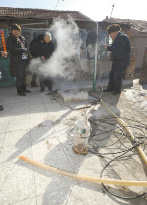 昨日上午,記者來(lái)到艾大娘家,還沒(méi)等進(jìn)院就看見(jiàn)井里冒出來(lái)的熱氣。艾大娘說(shuō),以前從來(lái)沒(méi)出過(guò)這事。說(shuō)著,又從井里打上來(lái)一盆水,記者用手試試溫度,這水還真燙手。隨后,艾大娘拿出一個(gè)雞蛋放到水里,一會(huì)兒工夫,剝開雞蛋,蛋清基本熟了。